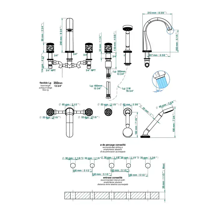 THG HIRONDELLES GOLD STAMPED Смеситель на борт ванны на 5 отверстий, двойной, с ручным душем, цвет Soft gold