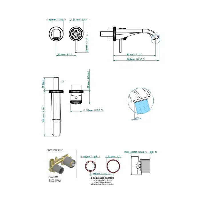 THG HIRONDELLES PLATINUM STAMPED Смеситель для раковины настенный на 2 отверстия, внешняя часть, цвет Polished gold