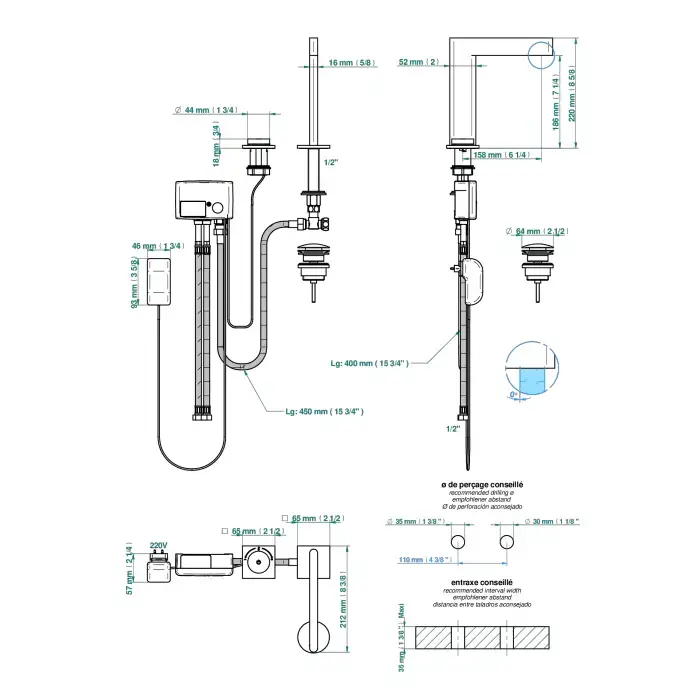 THG ICON-X TITANE A MANETTES Смеситель для раковины, 2 отв., электронный, с донным клапаном, цвет: полированное золото