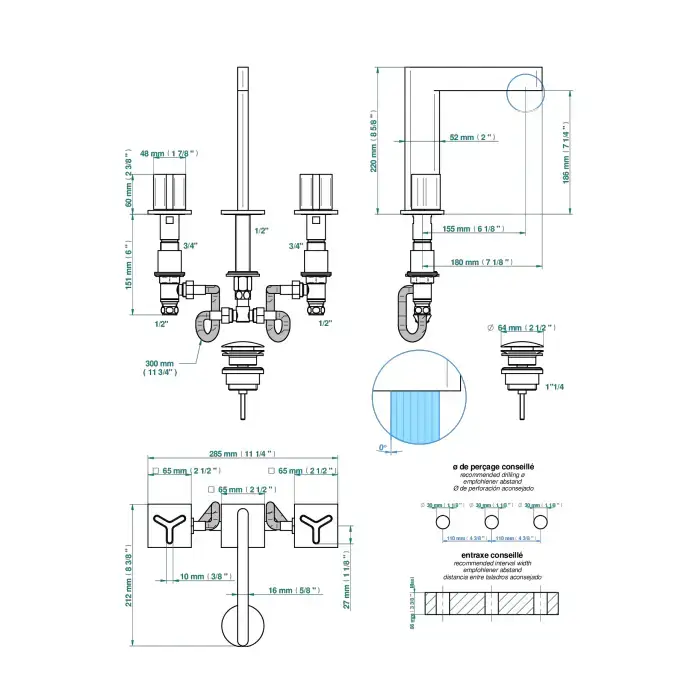 THG ICON-X TITANE Смеситель для раковины на 3 отверстия, с донным клапаном, цвет полированное золото