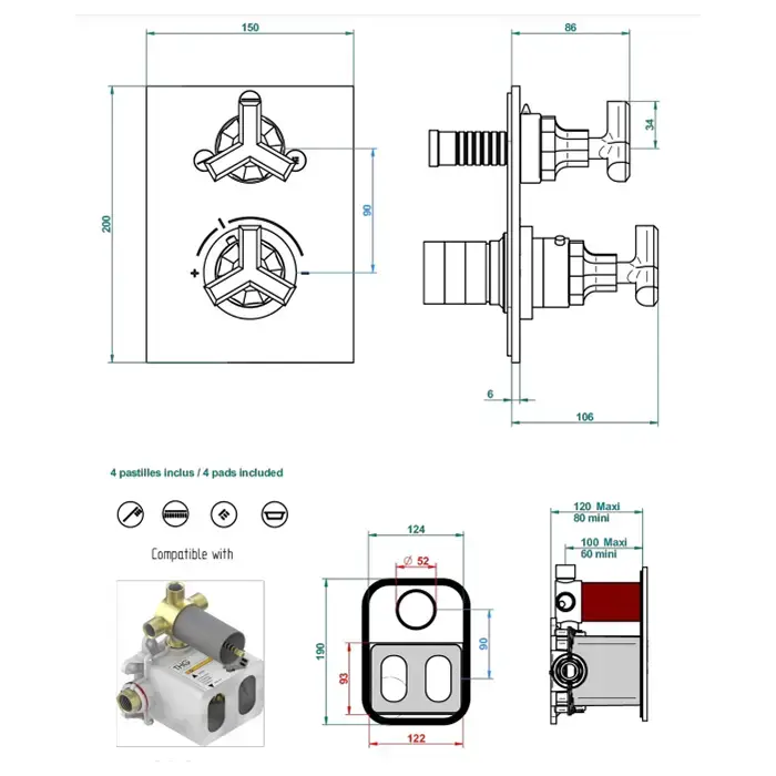 THG Les Ondes Смеситель для душа, термостатический, с переключателем на 3 потока, цвет Soft matt gold