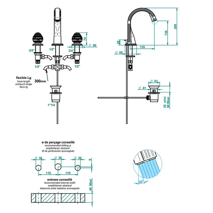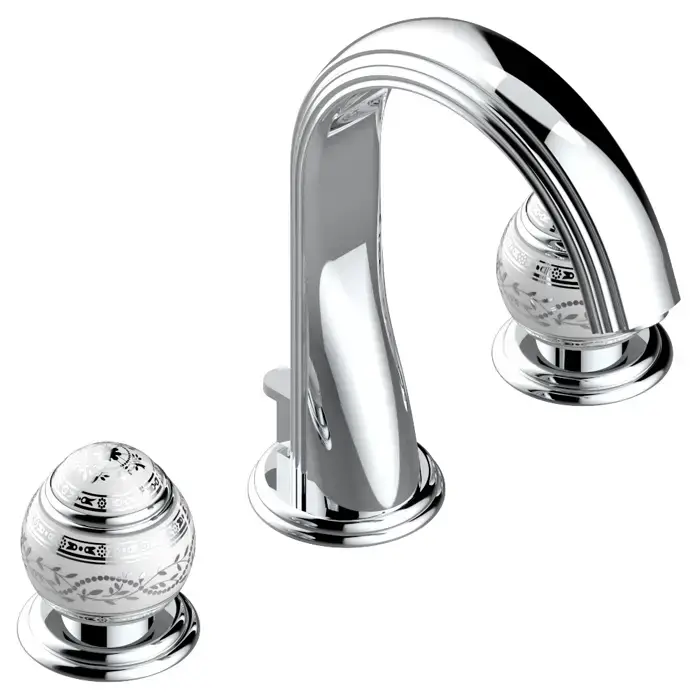 THG MARQUISE BLANC DECOR PLATINE Смеситель для раковины на 3 отверстия, с донным клапаном, ручки белые, декор платина, цвет хром