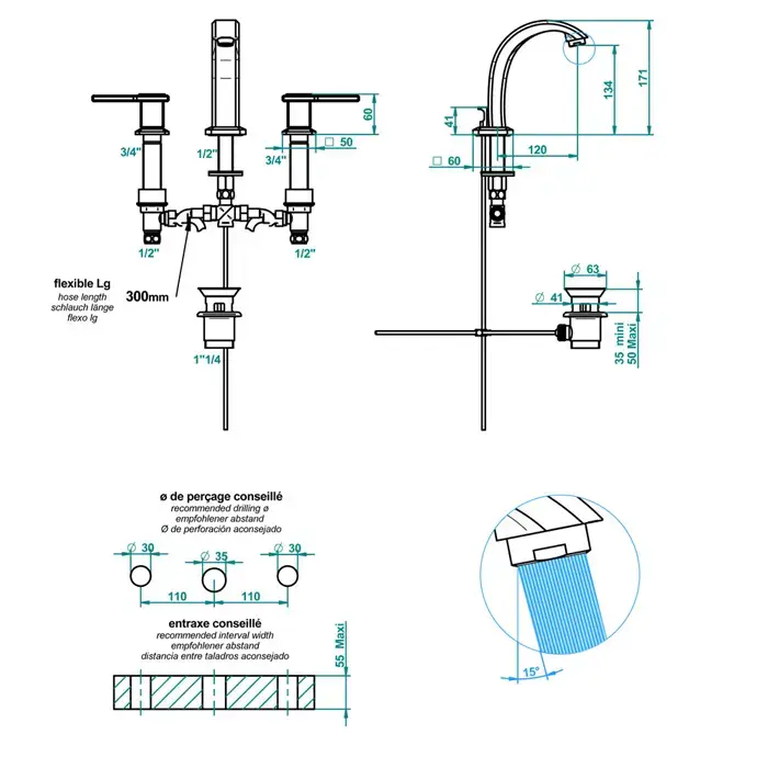 THG METROPOLIS CRISTAL NOIR A MANETTES Смеситель для раковины на 3 отверстия, с донным клапаном, цвет хром