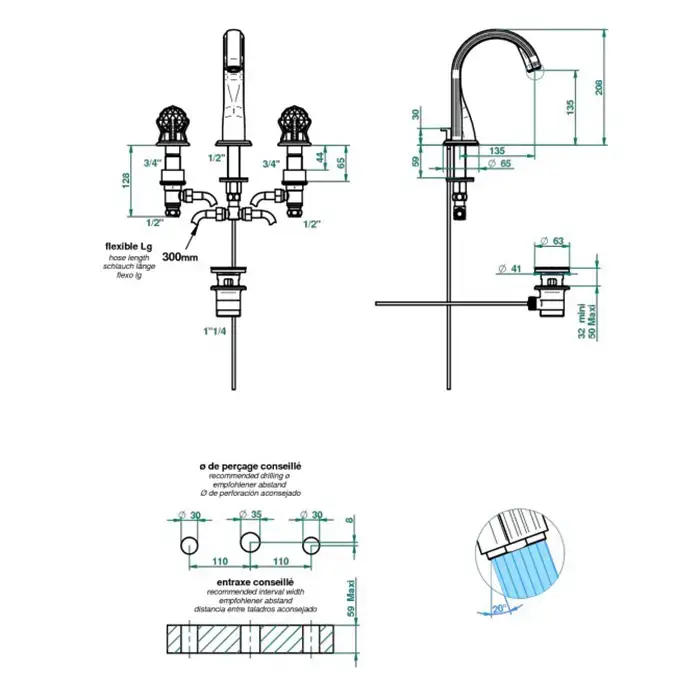 THG NAJEM Смеситель для раковины на 3 отверстия, с донным клапаном, цвет полированное золото