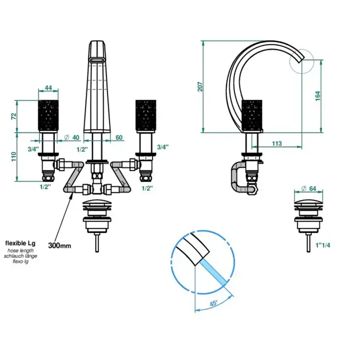 THG NIHAL PORCELAINE BLEUE Смеситель для раковины на 3 отверстия, с донным клапаном, цвет хром