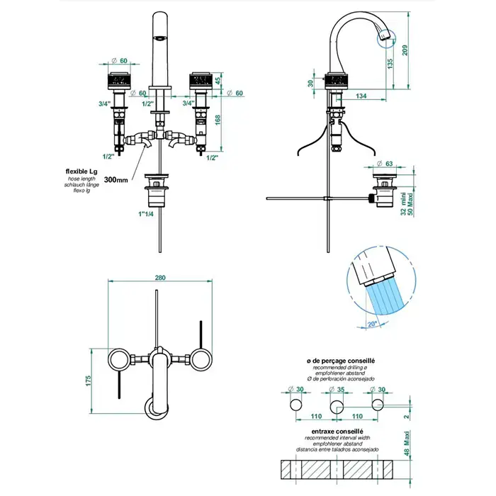 THG PARADISE Смеситель для раковины на 3 отверстия, ручки с подсветкой, с донным клапаном, цвет хром