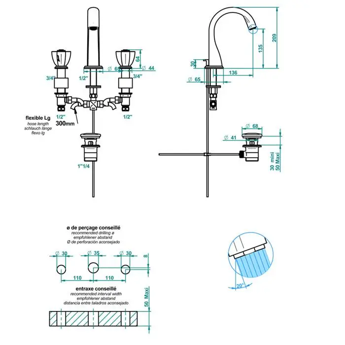 THG PETALE DE CRISTAL BLEU Смеситель для раковины на 3 отверстия, с донным клапаном, цвет хром