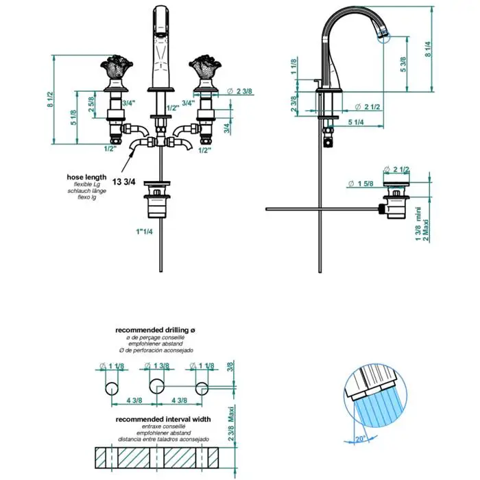 THG ROSE Смеситель для раковины на 3 отверстия, с донным клапаном, цвет хром