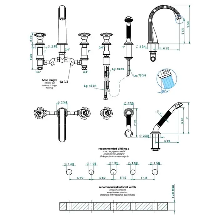 THG ROSE Смеситель на борт ванны, на 5 отверстий, с ручным душем, цвет полированное золото
