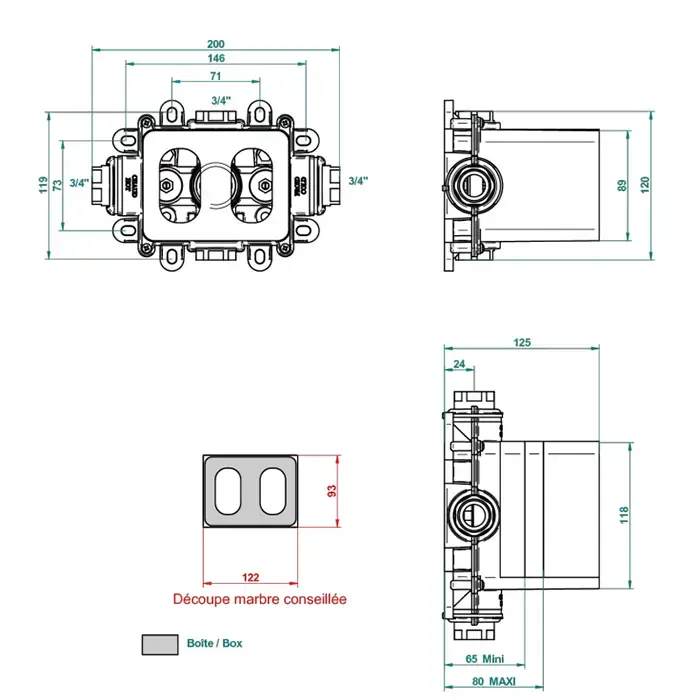 THG Термостат 3/4" - 60 л/мин с восковым картриджем и коробкой для встраивания, без ручки регулировки