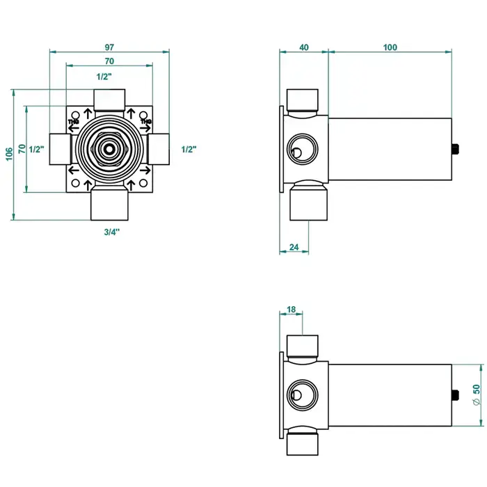 THG General items Встраиваемая часть вентиля/переключателя на 3 положения, вход 3/4", выходы 1/2"