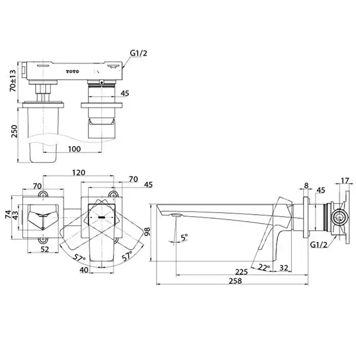 TOTO GE Смеситель для раковины встраиваемый 167x258x98мм без сливного клапана, цвет: хром