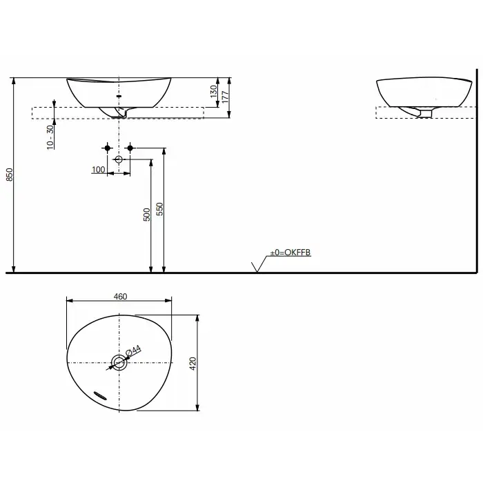 TOTO VESSEL TA Раковина460x420x177мм, ассиметричная чаша, без отв.под смеситель, с переливом, CeFiONtect, цвет: белый глянец