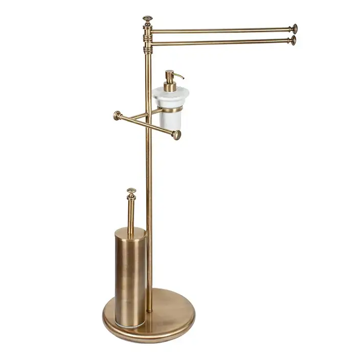 TW Harmony 004, стойка напольная, комбинированная: двойной п/держ, .керам.дозатор (белый), держатель т/б, ёршик, цвет держателя: бронза