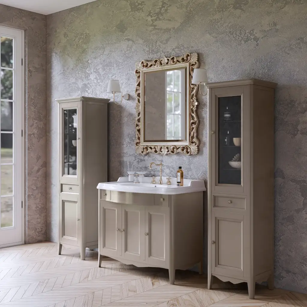 TW Veronica, База с раковиной Simas AR874bi*1 105x56см, с 1отв., 3 расп. дв. и 1ящик, доводч. Blum, ручки: Riflesso бронза, напольная, цвет: GRIDGIO