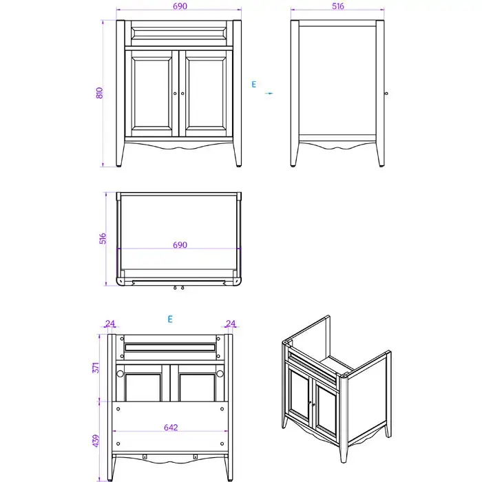 TW Veronica Nuovo комплект мебели с 2-мя дверцами, с доводчиками Blum, ручки: бронза, 73см, напольный, цвет: белый