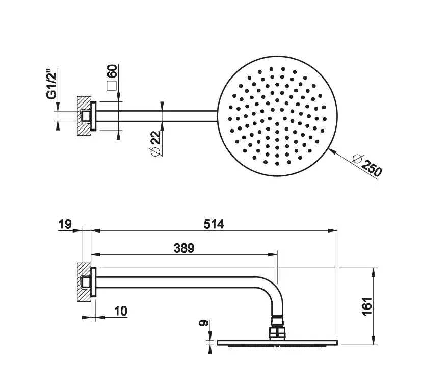 Gessi Rilievo Потолочная душевая головка на 1/2" 250x250 мм, длина изгот. под заказ (105 - 1855 мм), цвет: хром