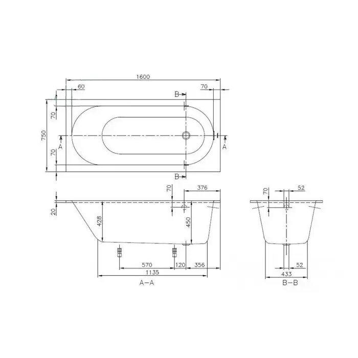 Villeroy&Boch Oberon Ванна встраиваемая 1600*750*450, к-т ножек, материал: Quaryl, цвет: альпийский белый