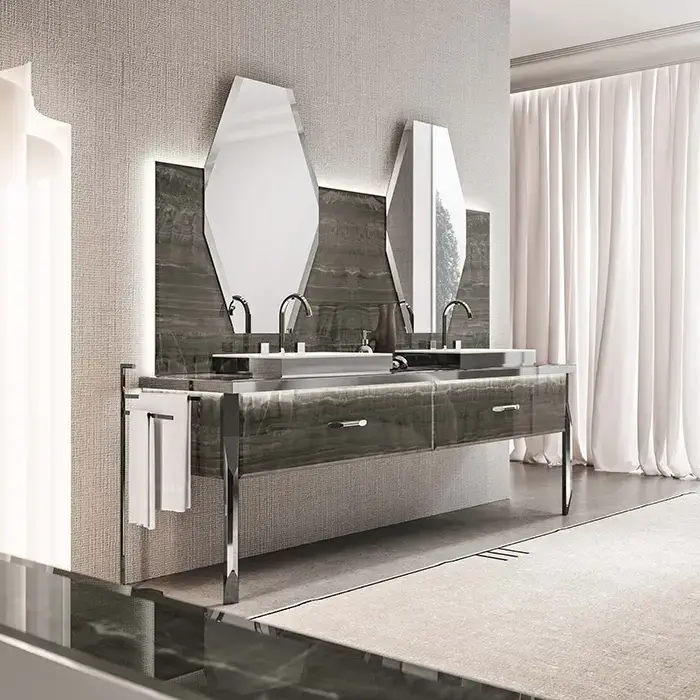 VITAGE milldue edition HILTON Тумба под 2 раковины 2266х566х770 мм, 2 бок стенки с ножками, 2 ящика, фурн полир сталь, отделка стекло Alabastro bronze