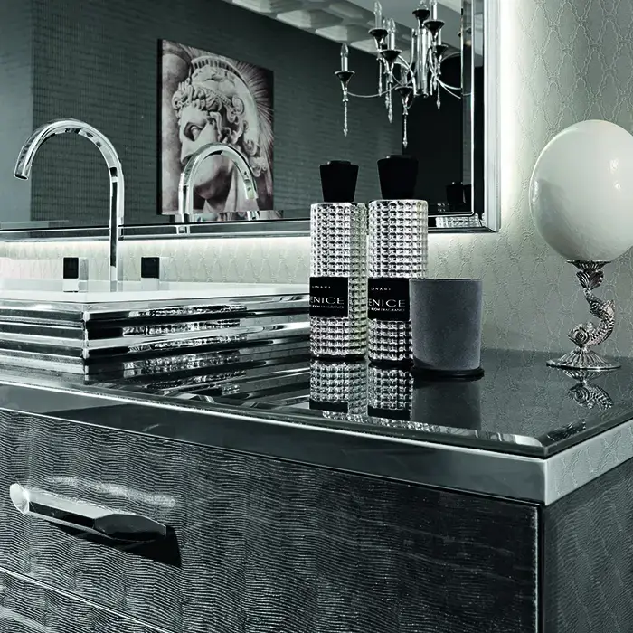 VITAGE milldue Hilton Столешница стекл 180х55.2х3,8cм., c 1 отв для раков, профиль сталь, отделка Alligator silver + подсветка 180см с трансформатором