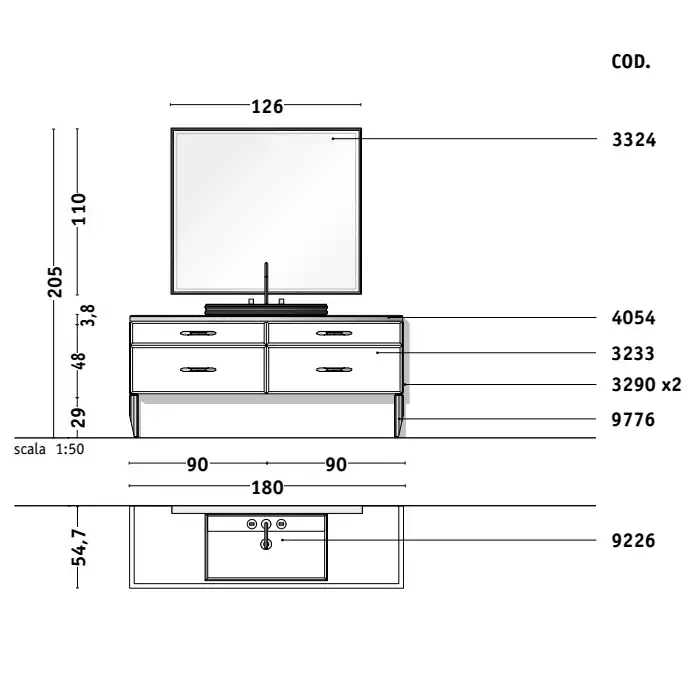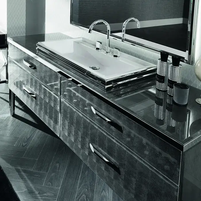 VITAGE milldue Hilton Тумба 3052 под рак180,8х54,9х77см, с бок стенками-3290, 4 ящ с ручками, 4 ножки-9776, фурн сталь, отделка стекло Alligator silv