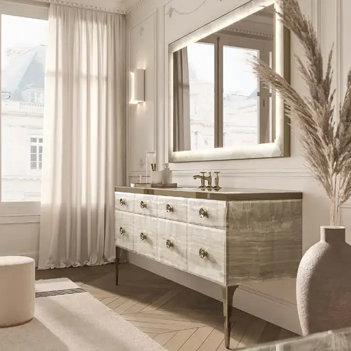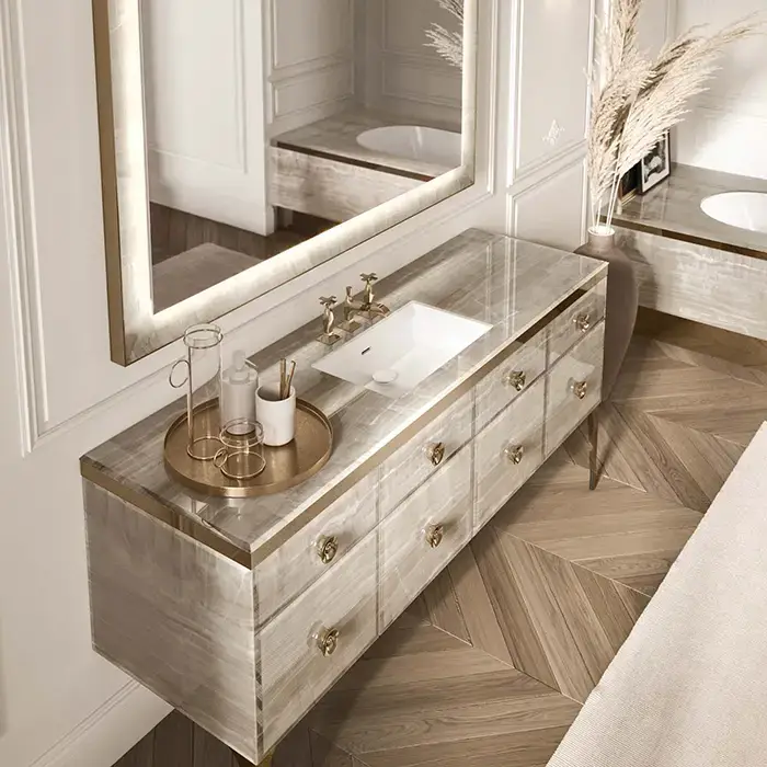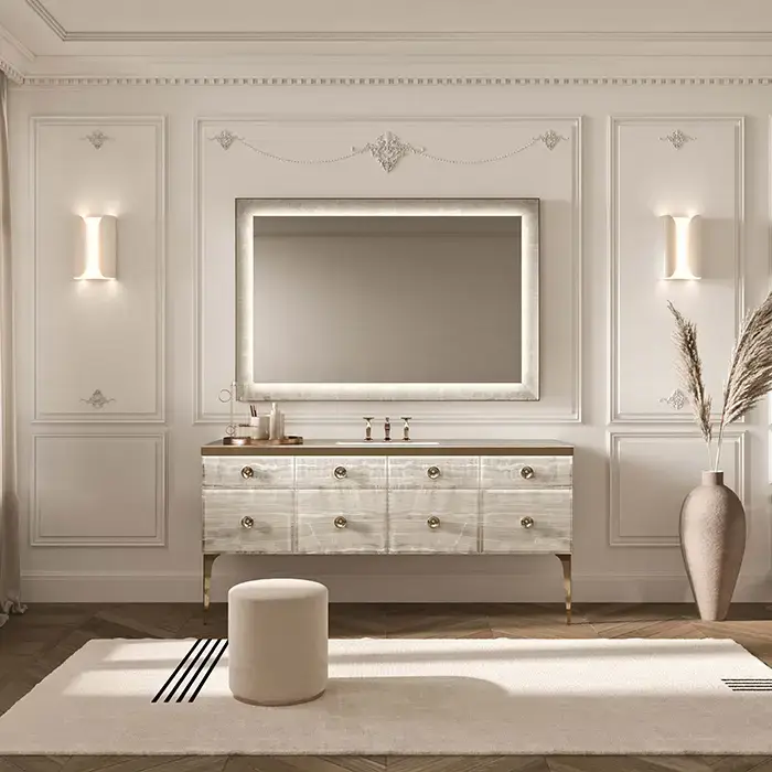 VITAGE milldue edition MAJESTIC Тумба под раковину 1808х549х824 мм, напольн, 5 ящик, 2 ножки, 2 бок стенки, фурн Bronzo, отделка стекло Alabastro gold