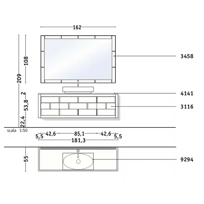 VITAGE milldue edition Ritz Столешница п/рак 181х54.9хh0.8см c 3отв. лак. стекло, цвет: riso-09