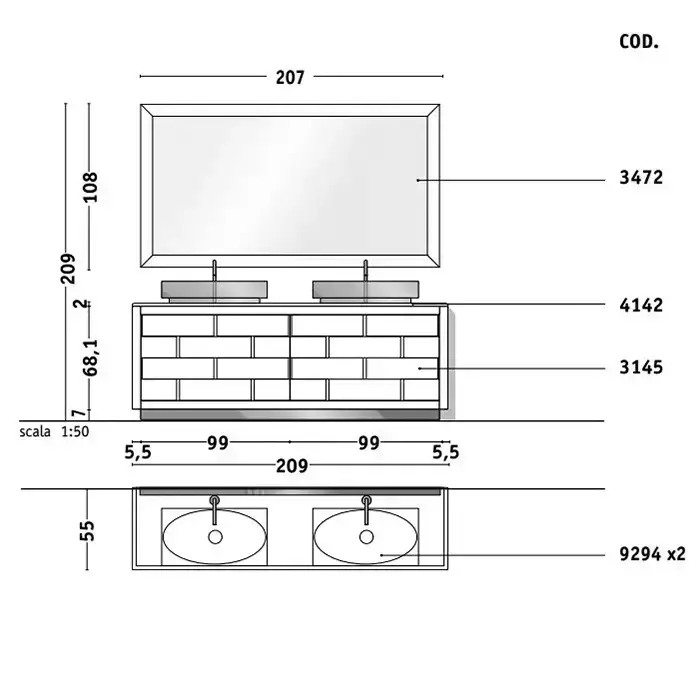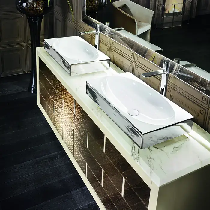 VITAGE milldue edition Ritz Столешница 2090х549х20 мм., с 2 отверстиями для раковины, с 2 отверстиями для смесителя, мрамор Paonazzetto